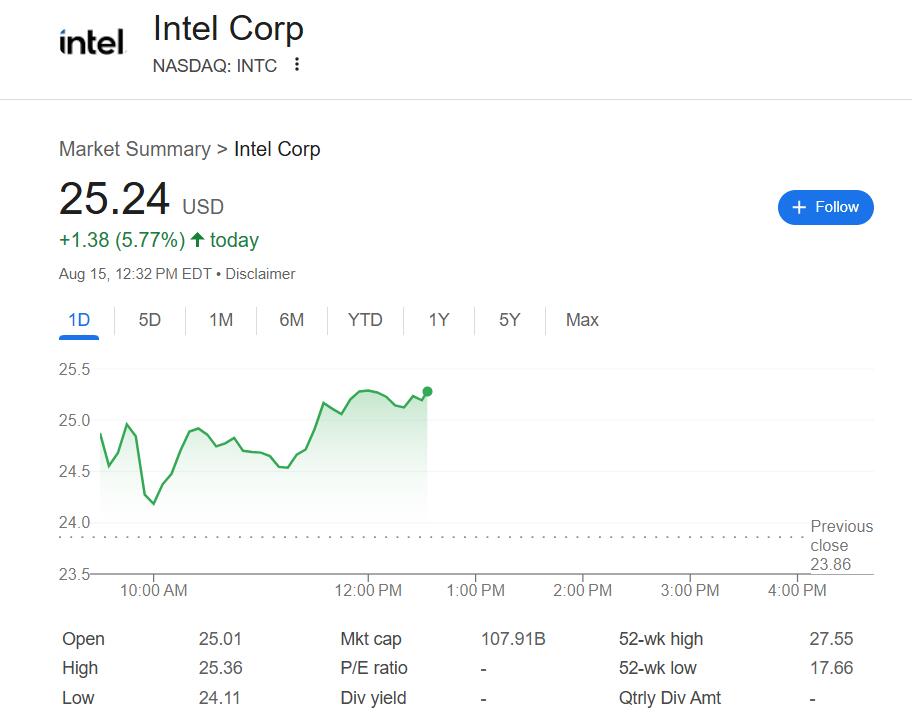 音讯传出后,英特尔股价本周周五开盘后保抓涨势,盘初曾涨5.3%,特朗普称两周内书记半导体关税后涨幅曾收窄到约1%,后扩大涨幅,附进午盘时一度涨约6.3%,势将在周四传出好意思国政府谈判平直入股英特尔的音讯后进一步走高,到收盘,股价两日涨幅有望突出10%。