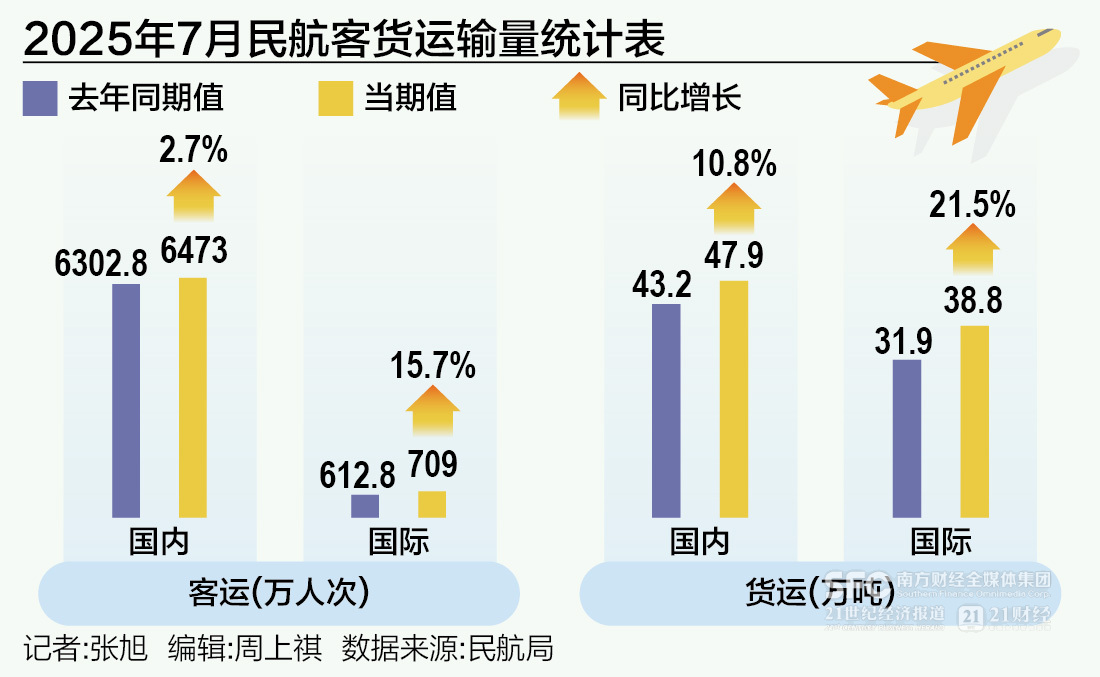 民航局近日公布的数据线路,客运方面,7月国内航空市集完成游客运输量6473万东谈主次,同比增长2.7%。海外航路完成游客运输量709万东谈主次,同比增长15.7%,限制创历史新高。